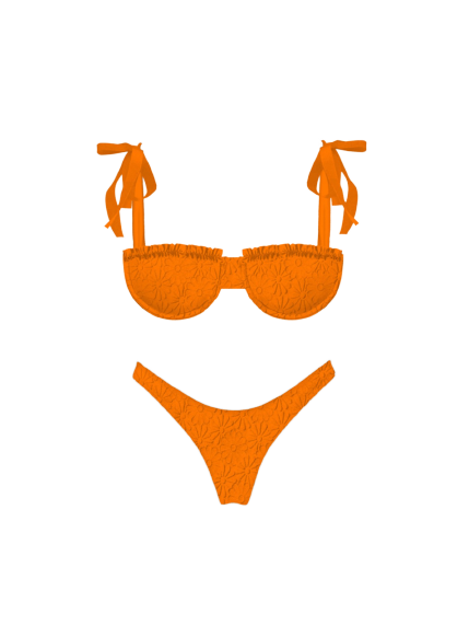 Jacquard daisy fabric bikini top with ruffles and tie straps