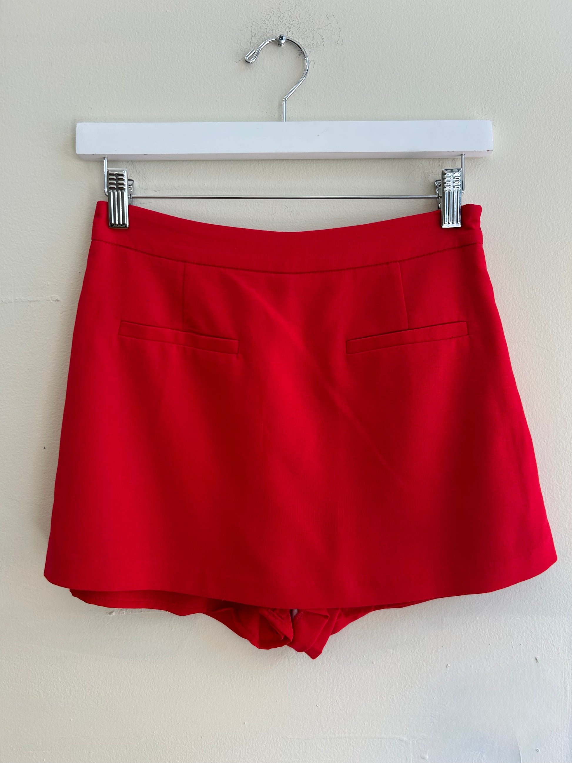 Linen blend mini length skort with front welt pockets, lining, and metal zipper at side.