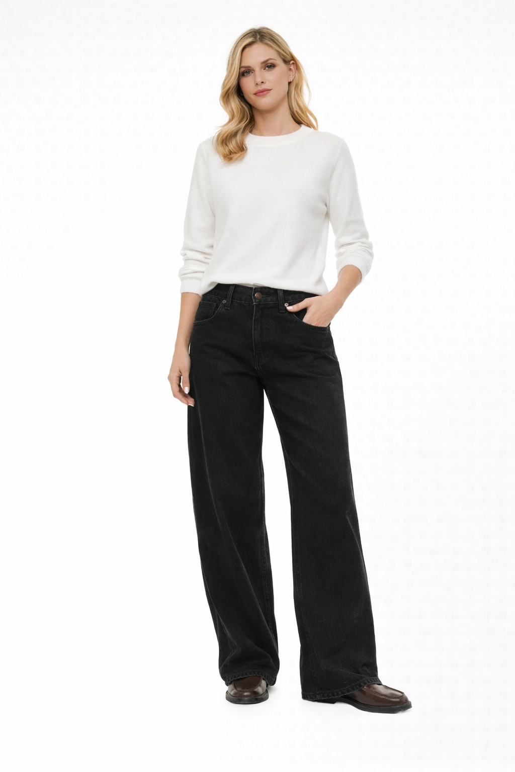 This non-stretch jean features a relaxed, baggy fit that sits at the waist and drapes into a roomy wide-leg silhouette for a laid-back, effortless vibe. Finished in a dark denim wash, it brings rich tone and timeless appeal to any outfit.